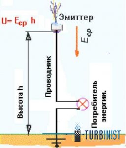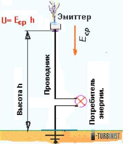 Под действием электрического поля Земли электроны проводимости из земли движутся по проводнику через нагрузку и далее вверх к эмиттеру, который освобождает их из поверхности металла верхушки проводника и отправляет их в виде ионов в свободное плавание по атмосфере. Электрическое поле Земли в полном соответствии с законом Кулона поднимает их вверх до тех пор, пока они на свем пути не будут нейтрализованы положительными ионами, которые всегда опускаются вниз из ионосферы под действием того же поля.