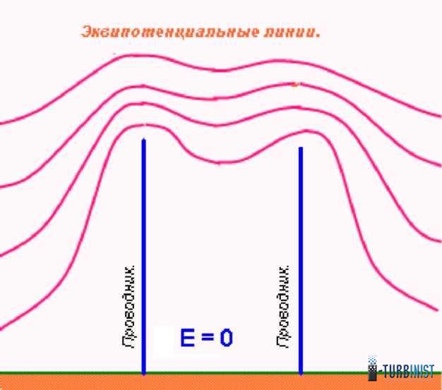 Рис. 6. Эквипотенциальные линии поля над заземленными проводниками.