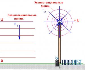 Рис.2. Электрические поля Земли (слева) и верхней точки проводника (справа).