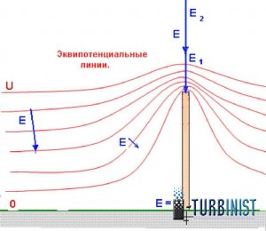 Е -вектор напряженности эл. поля Земли. Е - то же верхней точки проводника.