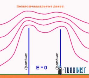 На рис.3 изображено суммарное эл. поле в сечении вертикальной плоскостью, проходящей через проводник. Примечательно, что потенциал проводника во всех его точках равен нулю и в то же время на верхней точке проводника сконцентрирована большая напряженность суммарного эл. поля Земли и проводника.