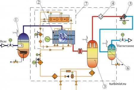 5-газоохладитель; 6-концевой сепаратор; 7-агрегат системы смазки