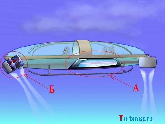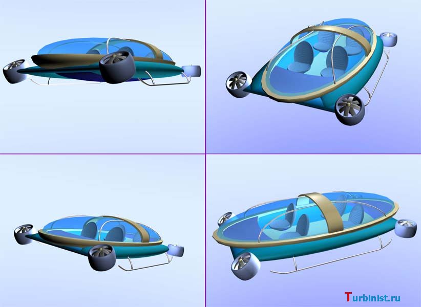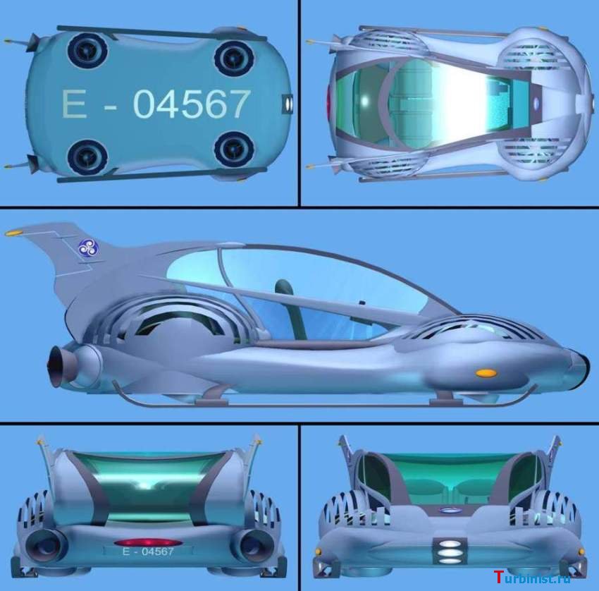Общий вид Флаера с 5 разных сторон, снизу, сверху, сбоку, сзади и спереди. Снизу большим размером написан номер машины, возможно он также будет размещаться на всех сторонах. Сзади имеется сигнальный красный фонарь, по бокам корпуса и на горизонтальных стабилизаторах, габаритные огни оранжевого цвета. Спереди галогеновые прожектора освещающие вниз, вперёд и вверх. Снизу 2 посадочные лыжи с регулировкой посадочного просвета. Вертикальная дополнительная тяга, способствующая поднятию Флаера, вместе с левитирующим эффектом, разуплотнённого в пространстве газа Гелия, а также выполняющая роль основной горизонтальной тяги, при частичном отведении вертикального потока воздуха, управляемыми соплами в сторону. Создаётся турбинами с куполообразным верхним винтом, работающие на электромоторах с сверхпроводящими металлами обмоток и сверх магнитными металлами статоров и роторов. Такие металлы, получаются методами электрической выплавки, при облучении плавящегося металла, высоковольтными пространственно временными электрическими полями. Один из таких методов описан ниже