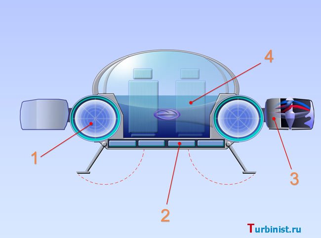 Рисунок 3. Схема поперечного сечения Флаера, с указанием элементов конструкции и описанием функциональных особенностей. Детальное описание камеры разуплотнённого гелия, проблем удержания такого вещества и возможным конструктивным решением. Особенности управления полётом, режимы стабилизации и манёвров. Данный принцип создания летающего автомобиля, основан на компенсации веса, за счёт подъём-ной силы газа Гелия, в состоянии разуплотнённого поля и пространства вещества.