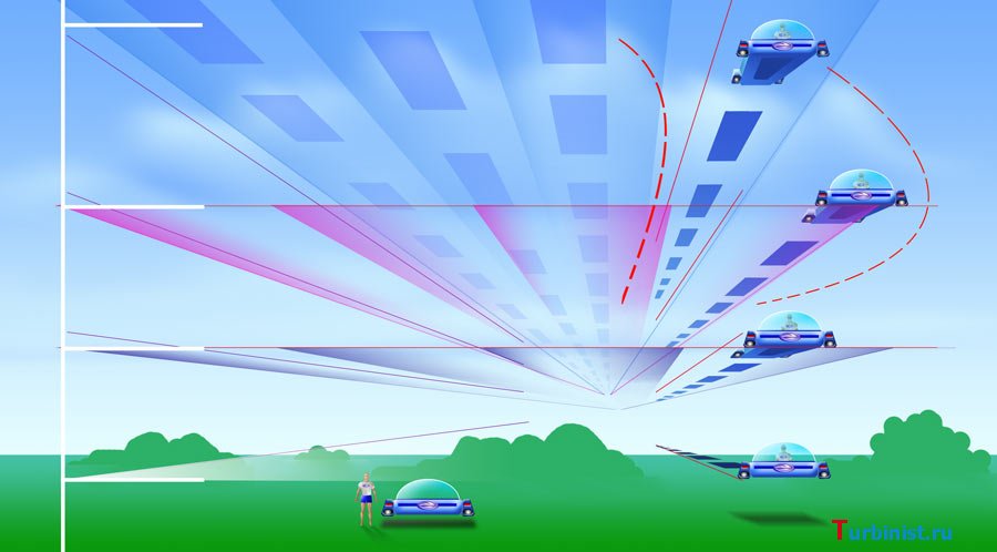 Возможная система организации движения Флаеров Многоуровневая и многорядная, с разными скоростными диапазонами на разных уровнях. 1. Надземный парковочный режим, на высотах до 3-х метров, с ручным управлением и скоростями до 30 Км/ час. 2. Второй основной и 1-й маршрутный уровень, на высотах от 3-х, до 10 метров и скоростью до 60 км/час. 3. Третий основной и 2-й маршрутный, с высотой от 10 и до 100 метров и скоростным диапазонам до 200 км/час. 4. Четвёртый уровень, скоростной дальнобойный, на высотах от 100 до 500 метров и скоростями до 400 км/час. Максимальный скоростной режим турбовентиля-торных двигателей и маршрутных Флаеров. Выше этого уровня, на высотах от 500 до 2000 метров, специальные высоко скоростные линии, для флаеров с реактивными и магнитосиловыми двигателями, максимальной скоростью до 900 км/час. Сверх звуковые лайнеры и специальные флаеры, со скоростями несколько Махов, двигаются на высотах от 2000 и до 20000 метров. Стратосферные машины, способные разгоняться до 2 - 5 км/секунду (7200 - 18000 км/час), летают на высотах до 70 км, а далее это уже суборбитальный транспорт, со скоростями до 7,5 км/секунду (27000 км/час) и высотой до 90 км. Орбитальные лайнеры и космические корабли на низких орбитах до 100 км, со скоростями 8 и более км/с.
