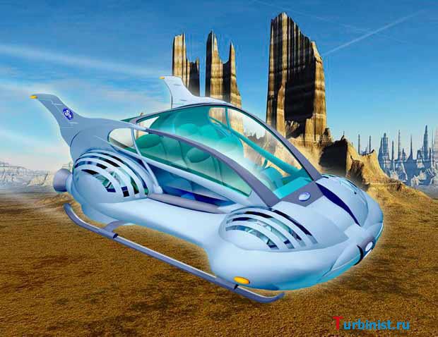 "Флаер" - Летающий аппарат, эволюция автомобиля, воздушное транспортное средство. Новая модификация проект 2008 г. Четырёхместный, компактный аппарат, с небольшим багажником. Вариант туристической манёвренной машины, для небольшой компании близких друзей. Основная подъёмная сила, за счёт пространственно разуплотнённого газа Гелия, в виде холодной плазмы. Основная горизонтальная управляющая и стабилизирующая тяга - электрическими, турбовентиляторными двигателями. Двигатели закрыты под обтекаемой декоративной решёткой.