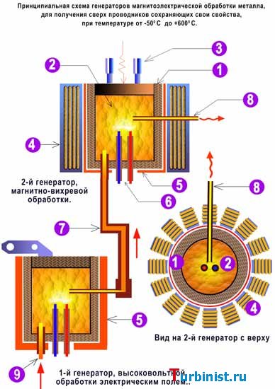Развивая эту технологию и создав цикл многих повторов выплавки и обработки металла, а также воплотив принцип поколений. Можно неограниченно увеличивать мощность двигателей, уменьшать их размер и потребляемую мощность, вплоть до искривления пространства времени. Принцип организации пространства времени, не запрещает уменьшать размеры и увеличивать мощности, любых процессов и технологий, так как, всё строится в диапазонах (+) и (-) бесконечности, макро и микро миров. Принцип поколений заключается в том, что металл, выплавленный в первом цикле обработки, используют для изготовления обкладок и обмоток, следующей пары генераторов, у которых новые свойства будут уже более высокими, по отношению к первым видам генераторов. Значит и металл, обработанный в генераторах второго поколения, будет иметь полевые и пространственно временные свойства, выше металла изготовленного в первых генераторах. В дальнейшем, металл из второго поколения генераторов, применяют для изготовления третьего поколения генераторов, в которых мощность электрического излучения, будет ещё выше, чем во втором поколении. Так далее, можно продолжать поколения за поколением, при неограниченном увеличении мощностей процесса и качества производимого материала.