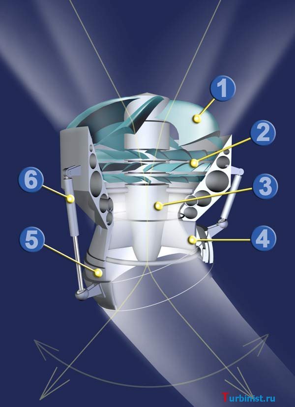 - сопло, с системой отклонения вектора направления реактивной струи, 3-мя гидравлическими цилиндрами 6., расположенными по бокам корпуса В отклоняемом 5. полусферическом сопле, возможно дополнительное завихрение воздуха, для усиления его целостного, ламинарного потока. Для уменьшения шума, на кромках сопла возможны рассекатели, которые деля воздух на отдельные малые потоки, тем самым, рассеивают его и уменьшают краевой, ударно - акустический звуковой эффект. Двигатели выполнены, из лёгких, нано структурированных, армированных материалов, возможно композитных полимеров, углепластиков. Для ещё большей прочности, нано волокна структурируют фрактальными электромагнитными полями высокой частоты, способствующие кристаллизации эфирных (элементарных) уровней организации материи.