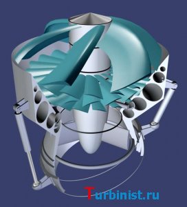 - общего осевого обтекателя. Скорости вращения компрессора и главного винта подбираются так, что в сумме, они компенсируют реактивный эффект. После компрессора, поток сжатого воздуха поступает в камеру компрессии, на выходе которой, есть пневматическая сжимающаяся кольцевая рубашка, которая регулирует давление в камере и скорость выхода воздуха. После камеры, воздух поступает в