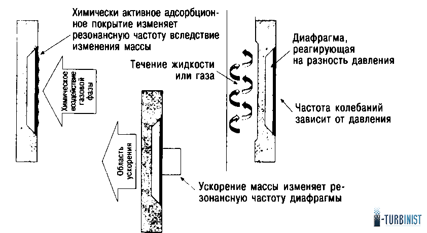 Измерением резонансной частоты вибратора (рис. 3.) можно контролировать любой внешний параметр, изменяющий силу растяжения перемычки, в том числе и температуру, поскольку различие коэффициентов теплового расширения вибрирующей перемычки и основания изменяет величину растягивающей силы. С другой стороны, при правильном выборе материалов можно практически полностью избавиться от температурной чувствительности датчика, что увеличивает точность измерения других физических параметров. При помощи такой микроструктуры можно измерять скорость струи газа, действующего на мембрану или измерительную перемычку. Кроме того, измерения можно проводить, нанося на перемычку химически активное покрытие, изменяющее ее размеры или массу под действием химических реакций или адсорбции.