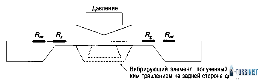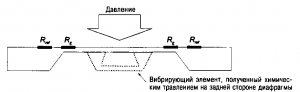 Первый широко используемый сенсор, основанный на кремниевой МЭМС, представлял собой диафрагму, на краю которой, т.е. в области больших деформаций, размещали пьезорезисторы. Во втором методе к измерительной диафрагме крепили механический резонатор в форме мостовой перемычки, как показано на рис. 3. Изгиб диафрагмы вызывает изменение силы натяжения перемычки и, как следствие, изменение ее резонансной частоты. Это позволяет достичь более высокой точности и устойчивости работы измерительного элемента по сравнению с пьезорезисторным методом, причем технологические этапы его создания остаются практически теми же.