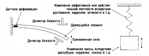 Отметим, что смещения и колебания могут возникать при изменении температуры или внешней нагрузки (рис. 2). До сих пор все описанные в литературе микромеханические датчики основаны лишь на этих двух явлениях, а именно на изменении резонансной частоты или появлении электрического сигнала при смещении двух частей измерительного элемента. Имеется два процесса, приводящих к возникновению электрического сигнала. Первый состоит в изменении электрического сопротивления термопары при изменении деформации или температуры. Этот принцип широко используют в микромеханических датчиках уже более 20 лет. Второй основан на изменении электрической емкости двух параллельных плоскостей, одна из которых может перемещаться. В некоторых ситуациях движение может быть обнаружено оптически, что позволяет комбинировать тензодатчики и оптические волокна. Хотя этот метод кажется привлекательным, на практике он применялся не слишком широко.