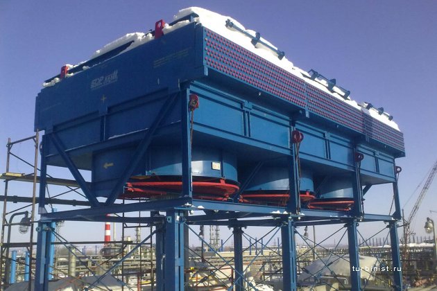 Группа охладителей служит для охлаждения масла низкого давления. Охлаждаемое масло проходит по трубам теплообменника, а охлаждающий воздух просасывается через густо сребренные наружные поверхности теплообменника вентиляторами.